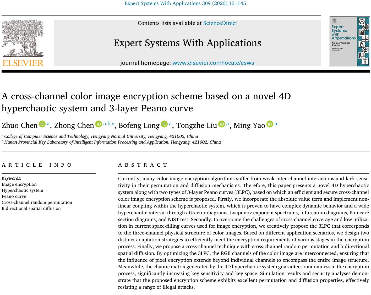 近日,我校计算机科学与技术学院2023级网络空间安全学术硕士研究生陈卓作为第一作者,在陈中教授的指导下,于国际权威期刊《Expert Systems With Applications》发表了题为《A cross-channel color image encryption scheme based on a novel 4D hyperchaotic system and 3-layer Peano curve》的研究论文。衡阳师范学院为该论文的第一署名单位。该期刊影响因子7.5,为JCR/中科院双一区Top期刊。