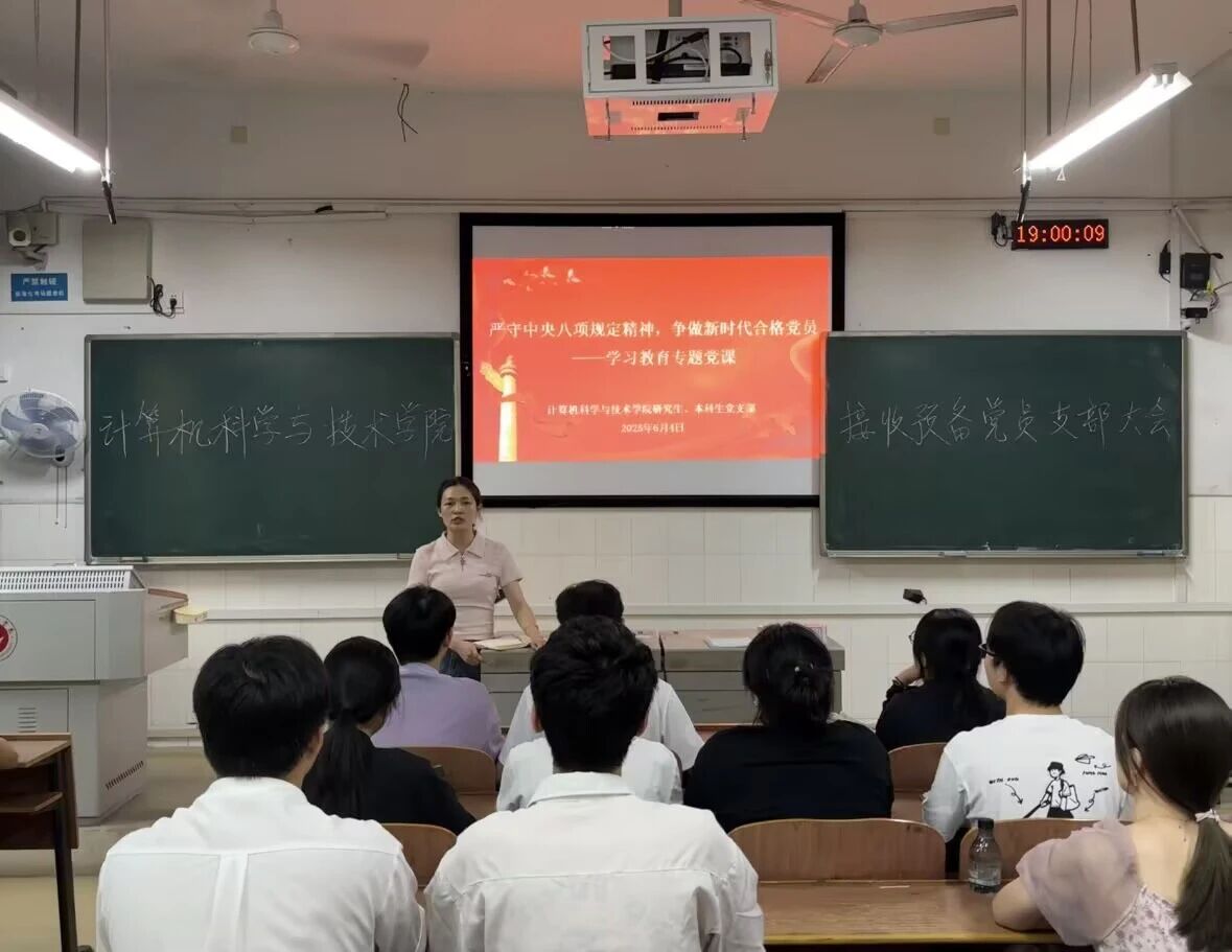 为进一步壮大学生党员队伍,切实推进党支部建设。2025年6月4日,计算机科学与技术学院党总支于云海楼217教室召开“严守中央八项规定精神,争做新时代合格党员”学习教育专题党课暨接收预备党员支部大会。本次会议由研究生党支部书记陈小燕老师主持,23名发展对象参加。